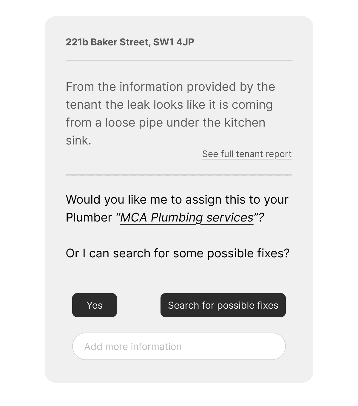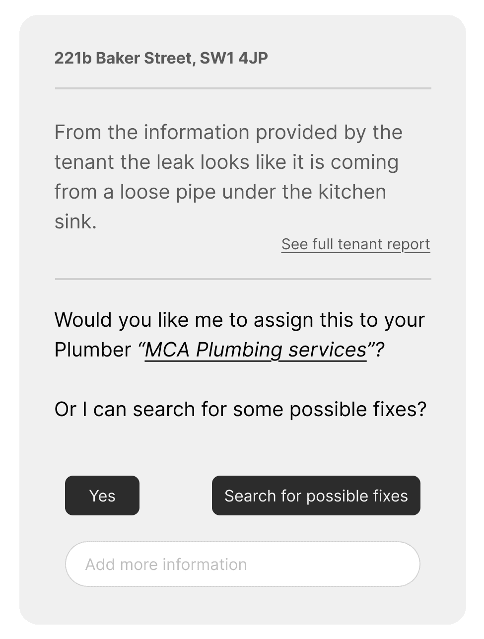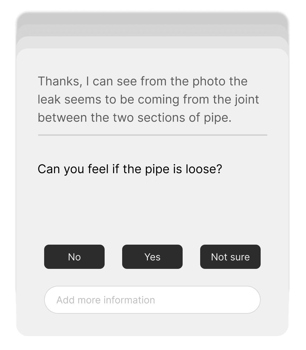 Agents spend years learning the common problems and quick fixes that occour within rental properties. Our maintenance triage service uses Ai to help the tenant collect information to help find the cause of the issue before the request is reported.