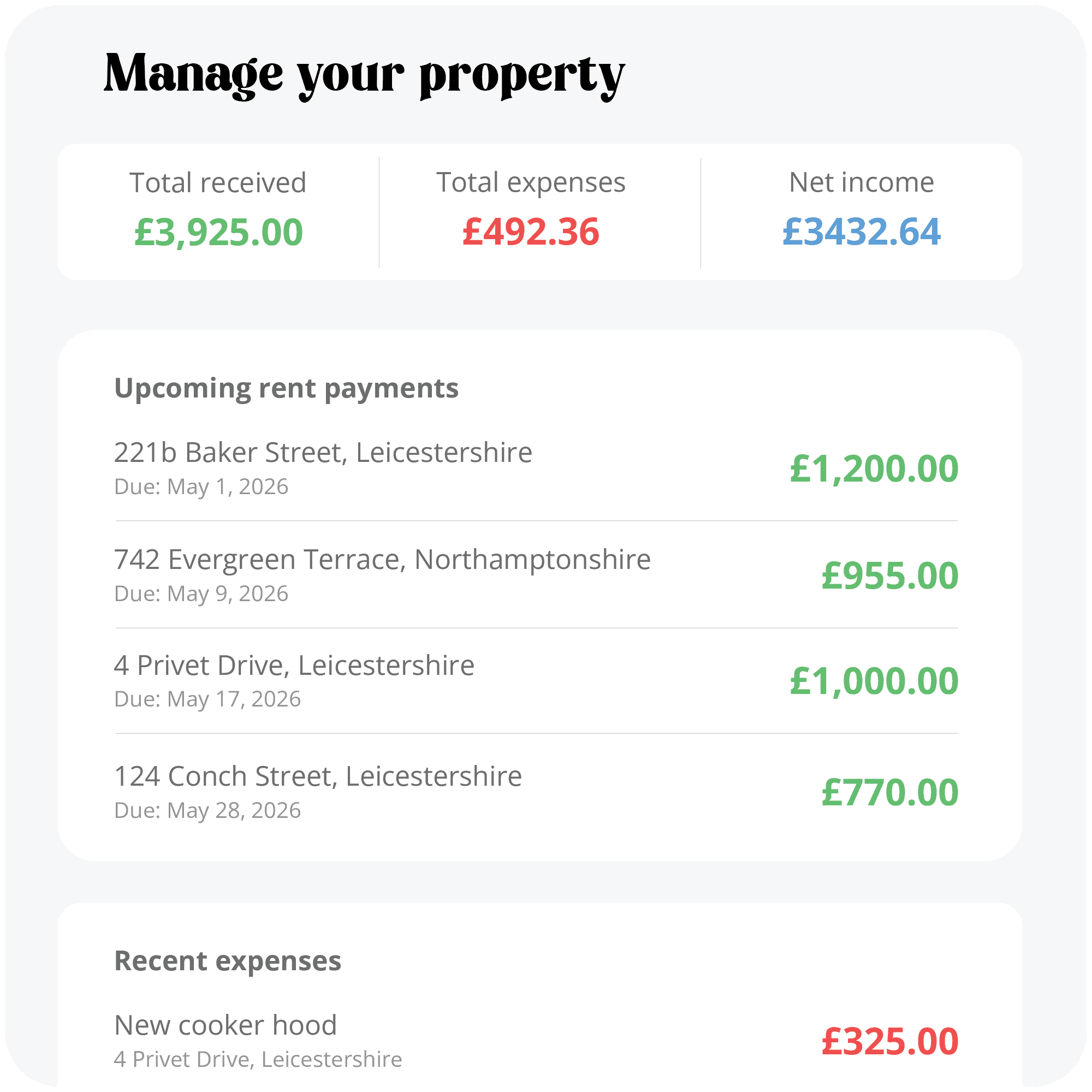 Our custom built payment system operates as your own virtal client account, we receieve rent, pay contractors and suppliers, transfer and receieve deposit payments. All tracked, instantly.